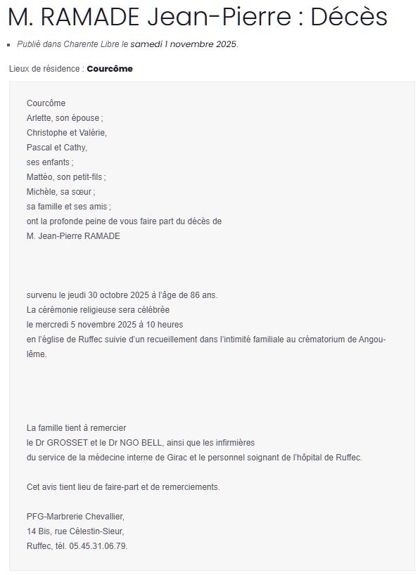 Le RAC a une pensée émue pour un grand nom du rugby ruffécois, Jean-Pierre Ramade. Il fut l'un des pionniers de la construction du club. Il fut joueur puis secrétaire. Une vraie figure du RAC et du Ruffécois en général. Il aimait raconter qu'il était la première licence joueur du club.